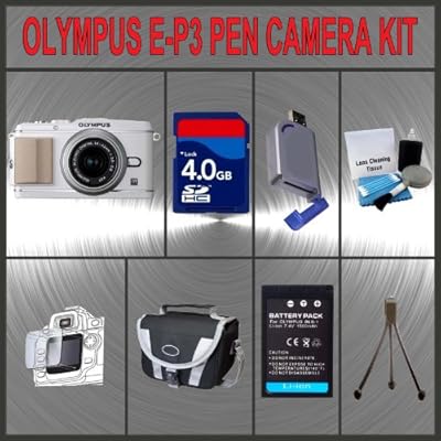 This Kit Includes:1) Olympus E-P3 PEN Digital Camera with 14-42mm Lens (White) 2) 4GB SecureDigital SDHC Memory Card3) High Capacity PS-BLS1 Replacement Lithium-Ion Battery 4) USB 2.0 SecureDigital (SDHC) Card Reader 5) Carrying Case6) Table Top Tripod7) LCD Screen Protectors8) LCD/Lens Cleaning Kit More about the camera: Blending the classic feel of an all metal body with the highly popular Micro Four Thirds trend in photography, Olympus presents their E-P3 PEN Digital Camera. This version of the E-P3 includes an ED m14-42mm II R f/3.5-5.6 zoom lens as well, to get you out shooting from day one. Highly desired for many reasons, Micro Four Thirds cameras provide an easily transportable body (this one with the look and feel that only a metal body can bring to hand) along with numerous lens options and the features and functions of a full-sized DSLR camera.