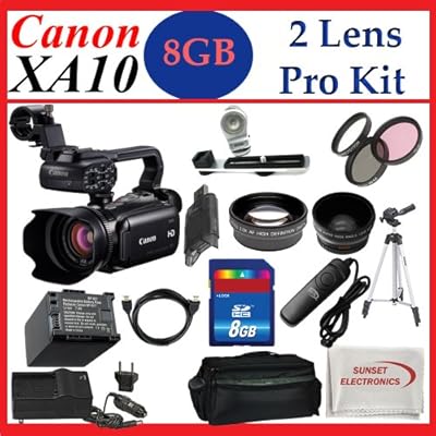 The Canon XA10 HD Professional Camcorder is a fully featured, ultra-compact pro video camera that shares nearly all the functionality of the XF100, but in an even smaller, run-and-gun form factor. Sporting a 64GB internal flash drive and two SDXC-compatible card slots, the XA10 can record literally for days without running out of memory. Able to capture AVCHD video at bitrates up to 24Mbps, the camcorder's native 1920 x 1080 CMOS sensor also lets you choose 60i, 24p, PF30, and PF24 frame rates for customizing the look of your footage. Bringing further professional oomph to that footage is a Genuine Canon 10x HD video lens, with lowlight sensitivity to f/1.8 and a 35mm equivalent zoom range of 30.4mm-304mm.Manufacturer's Supplied Accessories Canon XA10 HD Professional Camcorder Lens Hood BP-808 Battery Stylus Pen Microphone Holder/Handle Unit WL-D89 Wireless Controller AC Power w/Cable USB Cable Stereo Video Cable Component Cable Utilities CD-ROM 1 Year Parts & Labor Warranty SSE Package Includes: * 3-pc Filter Kit (UV, CPL, FLD)* Super Wide Angle Lens * 2x Super Telephoto Lens* 8GB Error Free Memory Card * Card reader * Replacement BP-827 Rechargeable Lithium Ion Replacement Extended Life Batteries* Rapid Home and Car Charger* Digital Camorder Case * Pro tripod * Tripod Shutter release * Video Light* Mini HDMI Cable* Exclusive Sunset Electronics Cleaning Cloth
