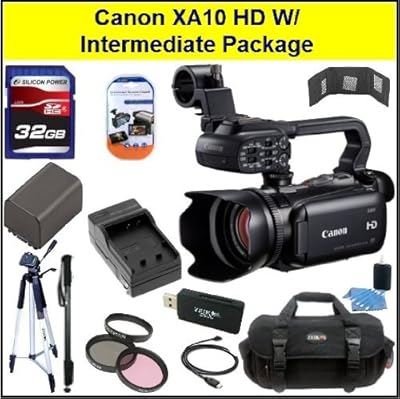 Canon XA10 HD 32GB Starters Package Includes: 1. Canon XA10 HD Professional Camcorder (Includes manufacturer's supplied accessories) 2. 32GB SDHC Class 10 Memory Card 3. USB SD Memory Cards Reader 4. BP827 Rechargeable Lithium Battery 5. Rapid AC/DC Charger 6. 58mm Multi-Coated UV Filter 7. Deluxe Camcorder Carrying Case 8. 57" Full Size Tripod w/Carry Bag 9. 67" Full Size Monopod w/Carry Bag 10. Mini HDMI-HDMI Cable 11. Pack of LCD Screen Protectors 12. Lens/LCD Cleaning Kit 13. Memory Card Wallet